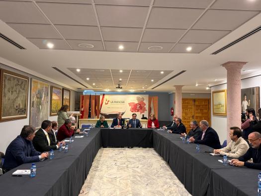 Alcázar de San Juan (Ciudad Real), 21 de enero de 2026.- El consejero de Agricultura, Ganadería y Desarrollo Rural, Julián Martínez Lizán, ha asistido este mediodía a la clausura del pleno de la Asamblea de la DOP Mancha, donde ha felicitado a Carlos Bonilla, que, tras ser reelegido, afronta su tercera legislatura como presidente de esta Denominación, deseando tanto a él como a la nueva junta directiva, suerte y aciertos en la toma de decisiones, y agradeciendo el trabajo realizado a la asamblea saliente.
