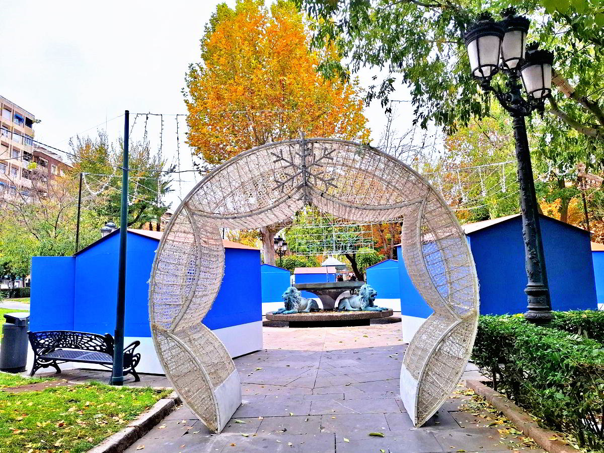 Una puerta luminosa en la Fuente de los Leones da entrada a la Navidad de Puertollano, en el punto donde este año como novedad y por primera vez se ha instalado el mercado artesano y de regalos navideños.