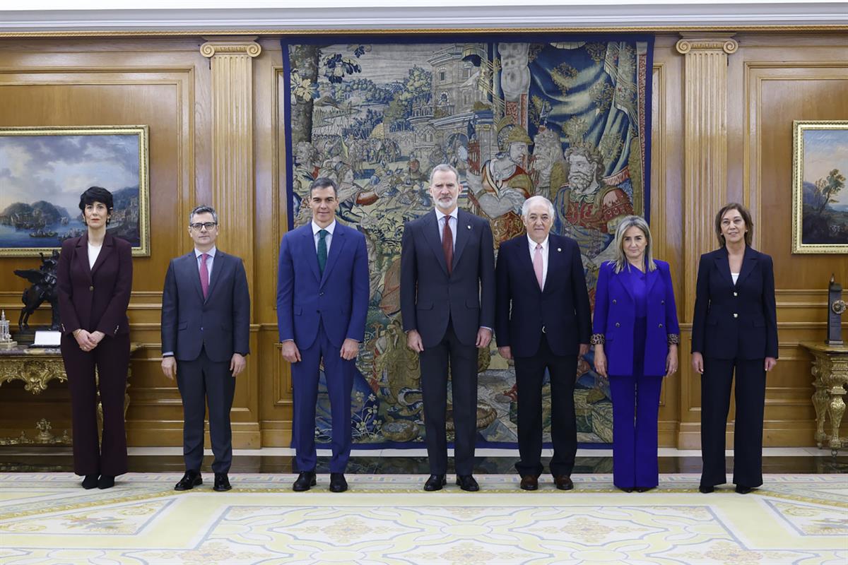 El presidente del Gobierno, Pedro Sánchez, junto al rey Felipe VI y las autoridades del Estado asistentes al acto de promesa de la nueva ministra de Educación, Milagros Tolón, y la portavoz del Gobierno, Elma Saiz (Casa Real)
