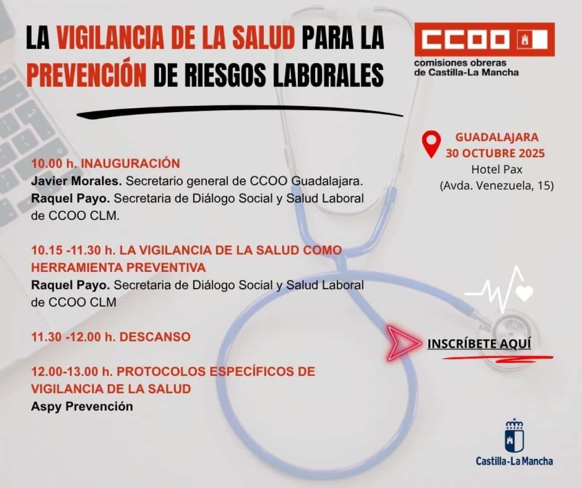 CCOO de Castilla-La Mancha ha organizado una jornada centrada en la salud laboral que se llevará a cabo el próximo 30 de octubre en la ciudad de Guadalajara. Durante este evento, se pondrá especial énfasis en la vigilancia de la salud como una herramienta clave para la prevención de riesgos laborales.