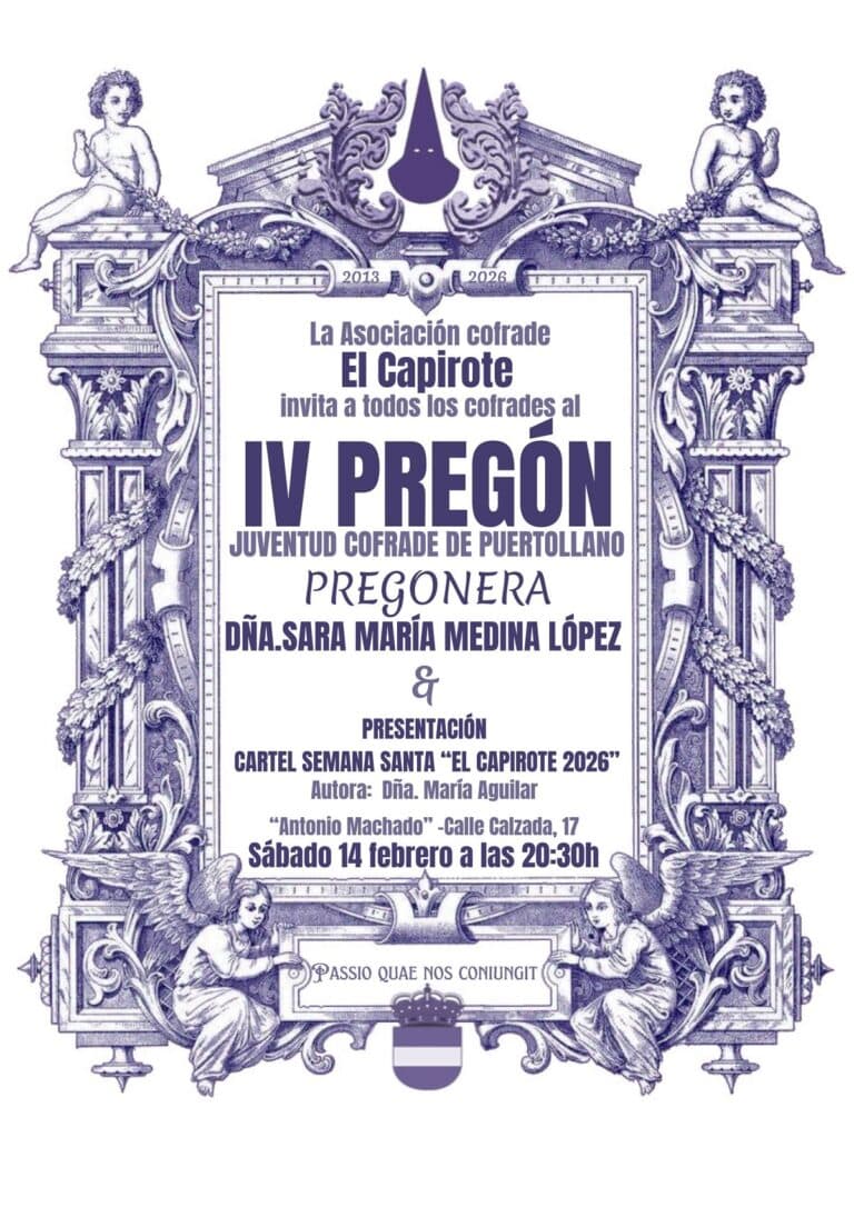 Sara María Medina López pronunciará el IV Pregón de la Juventud Cofrade de Puertollano de la asociación “El Capirote”, el sábado 14 de febrero a las 20,30 horas, en el Centro de Adultos “Antonio Machado” (Calzada, 17). Medina será la encargada de poner voz y sentimiento a la juventud cofrade de nuestra ciudad en un acto ya consolidado en el
