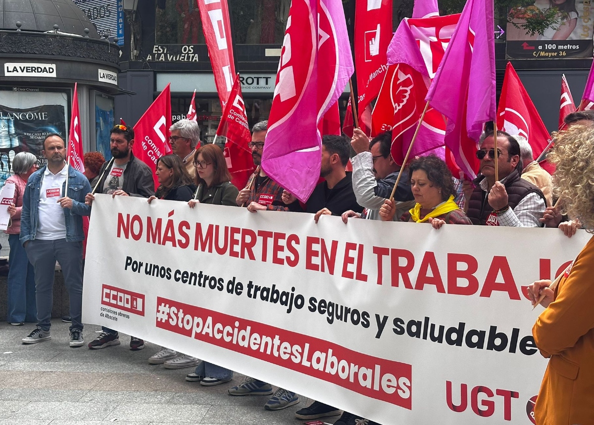 UGT y CCOO de Albacete se concentraron este martes 29 de abril en la Plaza Mayor de la capital provincial para reclamar, con motivo del Día Mundial de la Seguridad y Salud en el Trabajo, que los centros de trabajo dejen de ser lugares donde se arriesga la vida. Trabajadoras y trabajadores del tejido productivo albaceteño se sumaron a una movilización que los sindicatos repiten cada 28 de abril para insistir en algo que debería ser evidente: ir a trabajar no puede ser una amenaza para la integridad física.